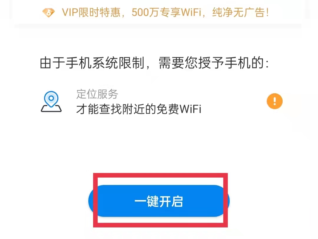 1.下载并打开“wifi万能钥匙”,点击“一键开启”,开启定位服务。