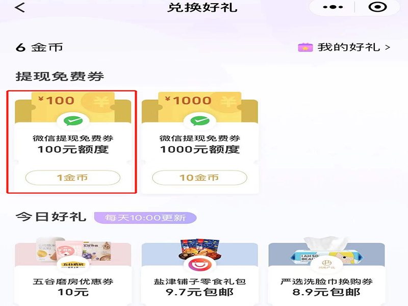 4、在兑换好礼页面上,选择兑换的额度,即可点击使用金币进行兑换。