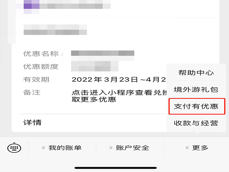 2、在微信支付页面上,选择“更多”,并点击“支付有优惠”,进入微信支付有优惠页面。