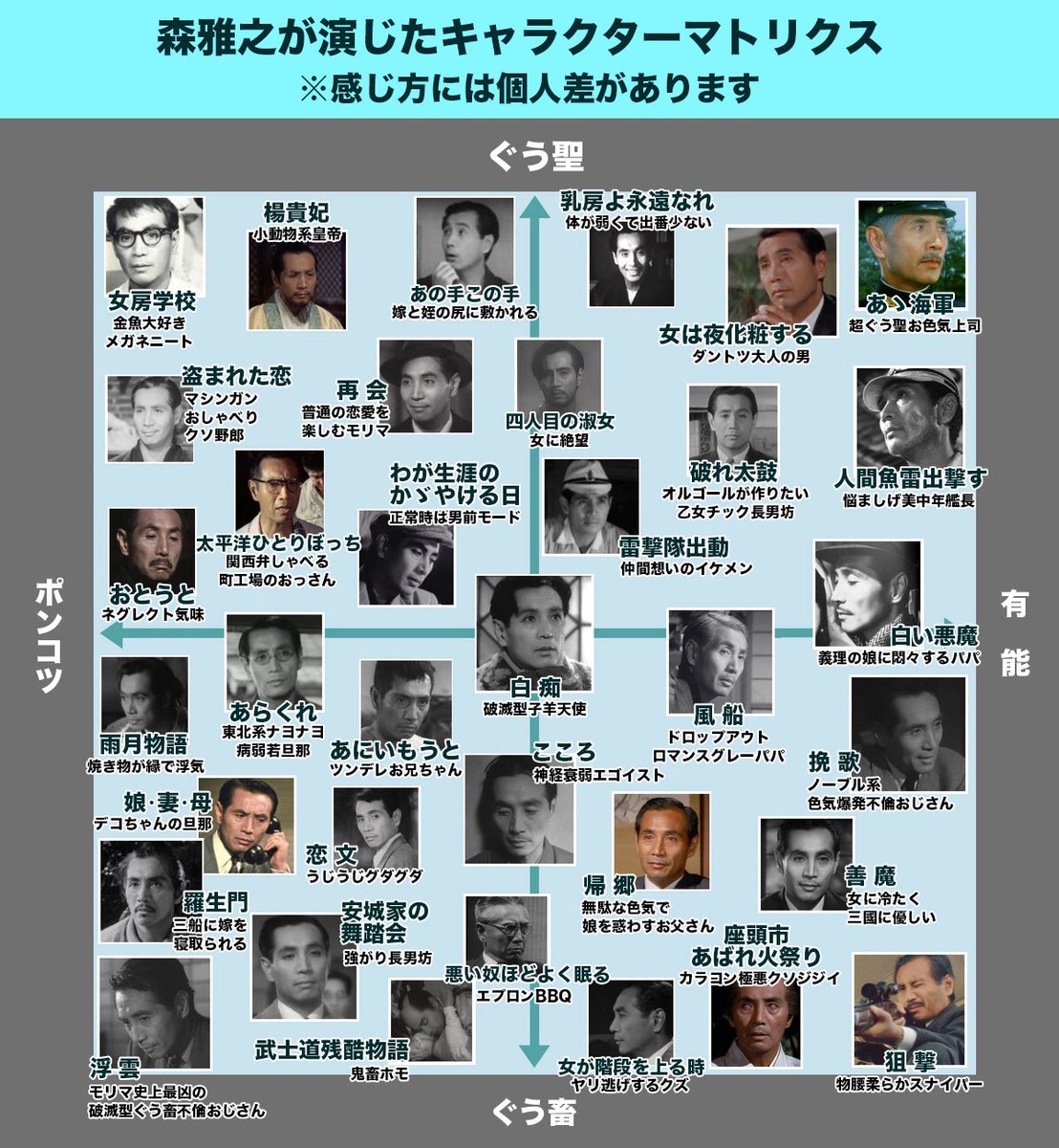 森雅之出生于北海道上白石村(现在札幌市白石区)。父亲是小说家有岛武郎,森雅之母亲是陆军大将男爵神尾光臣的女儿。1911年,森雅之的母亲与他父亲在札幌任教,并生下了他以及后来的两个弟弟。1916年,母亲因结核病去世,1923年,父亲也自杀离开。1932年,森雅之从京都大学哲学科中途退学以后,立志当一名舞台演员。他在小筑地剧场初次登台表演,从1937年到战后1950年,他一直参加演出剧团民艺。1947年,森雅之在叔父小说作品改编的电影《安城家的舞踏会》中扮演落没家族的长男开始受人瞩目,进入了电影界。并相继主演了同样是改编自文学作品的影片《雨月物语》、《浮云》等。给森雅之带来国际名誉的是《罗生门》,他出演片中的丈夫。后参演了黑泽明的《白痴》,利用深厚的舞台背景,为角色带来丰富微妙的演绎。晚年,森雅之曾活跃于电视连续剧中。1972年,剧团民艺公演的舞台剧《三人姉妹》成为了森雅之最后的作品。1973年,因直肠癌死去。森雅之的妻子是宝冢女演员梅树香,两人育有一女中岛葵(1945~1991),也是一名演员。
