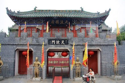 天波杨府 | 天波杨府是北宋抗辽民族英雄杨业的府邸,位于宋朝首都东京(今开封市)城内西北隅,天波门的金水河旁,故名“天波杨府”。因杨业忠心报国,杨家将世代忠良,宋太宗赵光义爱其清正刚直,不善巧言谄媚的性格,敕在天波门的金水河边建无佞府一座,赐金钱五百万盖“清风无佞天波滴水楼”,并亲笔御书“天波杨府”匾额。为国家AAA级景区。 |