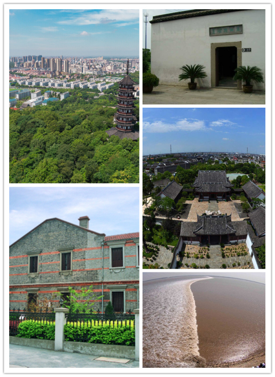 (概述图片自上而下顺时针依次为:海宁城区、王国维故居、盐官古城、海宁潮、徐志摩故居)