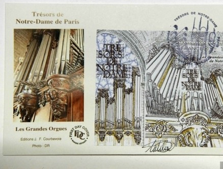 2022年4月15日,法国发行巴黎圣母院珍宝主题邮票,旨在纪念巴黎圣母院大火三周年。邮票图案为圣母院的管风琴,邮票面值1.65欧元,以小型张形式印制,总印量55万张。