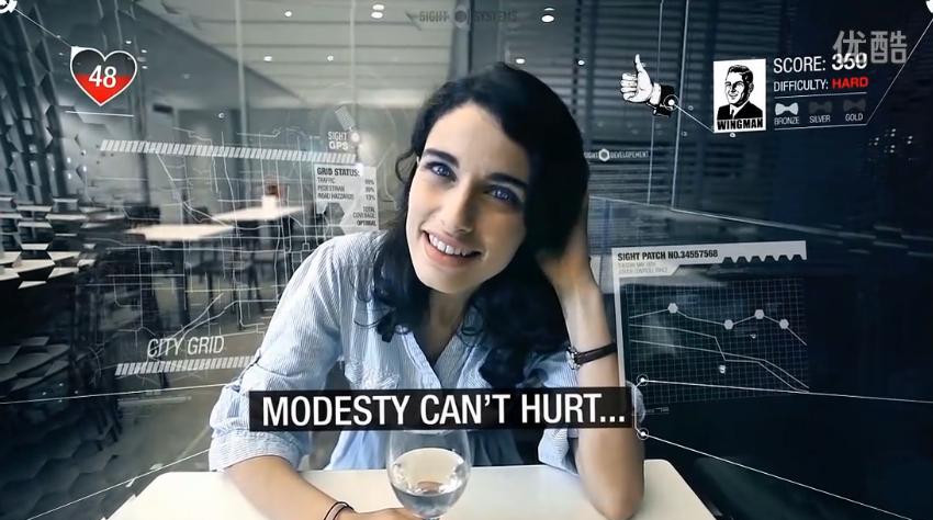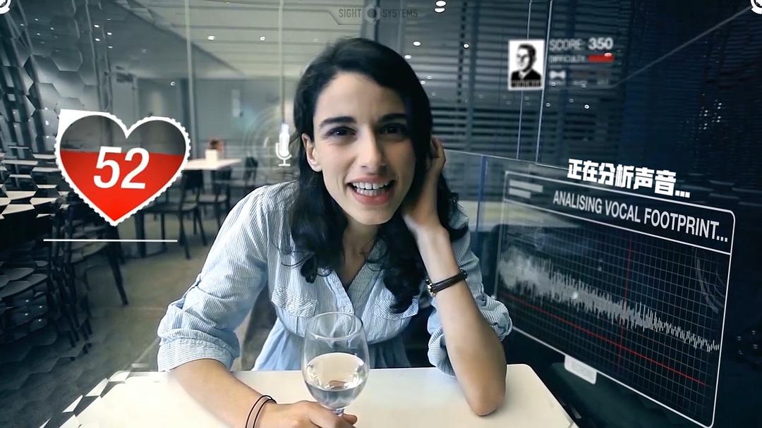 当男主人公赴约时,他打开了“Wingman”的社交应用软件。美丽的达夫妮·威尔逊的一颦一笑,其实都在“Wingman”先进的脸部识别和肢体语言识别截图表下,分析得淋漓尽致。当男主人公成功了获得了达芙妮的芳心后,达芙妮举起红酒杯刚要一饮而尽,可是她也通过“Sight”发现了这不过只是个“A dating APP”。