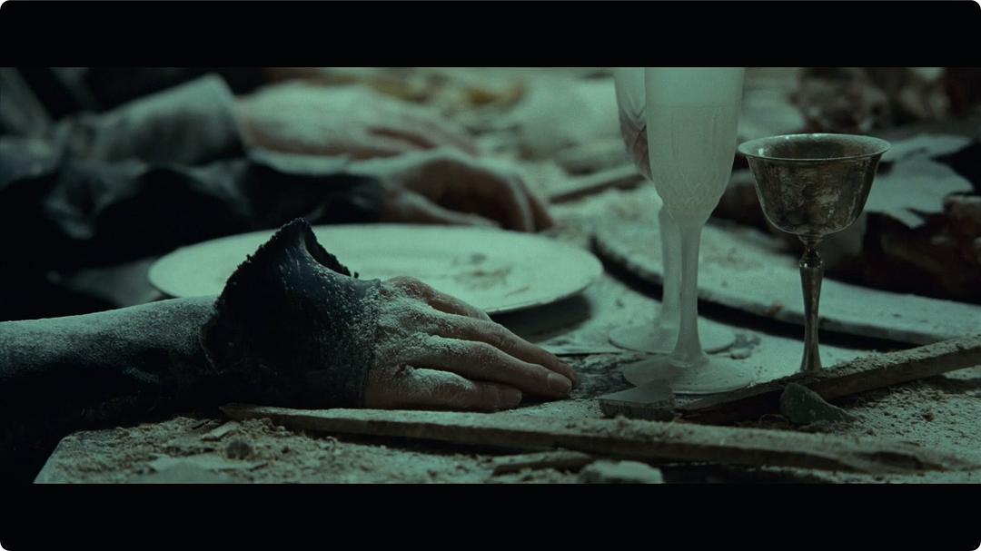 在一间光线不甚明朗的房间内,长长的餐桌上摆放着极度奢华的美味盛宴,衣着考究的客人低头埋首,大快朵颐,风卷残云一般销蚀着桌上的美食。这些客人有的身穿军装,有的如同贵族,有的似乎是宗教领袖,无一例外的是每个人身上都满是灰尘,好像刚刚经历着一场莫大的灾难。食物一盘盘端了上来,盘子上满是动物血淋淋的尸体和内脏。客人们宛如饕餮无度的饿鬼,旁若无人地不断进食。就在此时,地板突然断裂,客人连同餐桌跌落到下一层。服务人员们淡定自若地迁到下一层,简单打扫后宴会继续。