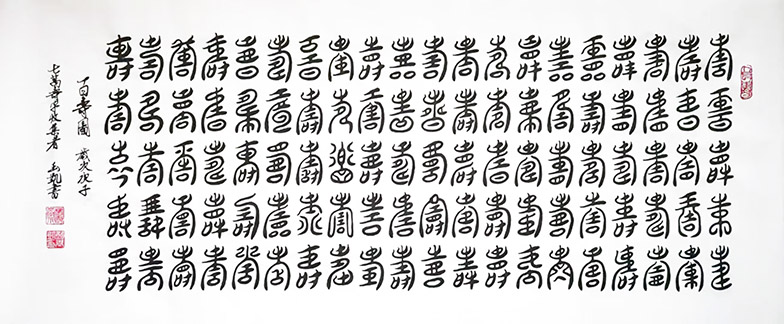 他近四十年如一日,悉心索研中国古文字中异体数量最多的“寿”字,作为自己陶情冶性的精神寄托。他三十八年的整理工作,在认真研究汉篆肩胛结构的基础上,将计算机技术与书法艺术结合在一起,创造出电脑美术字,共计有手写和电脑笔记8000余页;并已将其中近六万字录入电脑;计划编纂“电脑美术篆体”与“书写篆体”版《中国寿字集锦》各六集,目前整理工作仍在努力进行中。