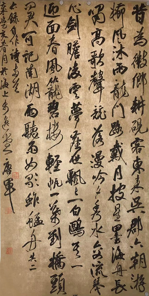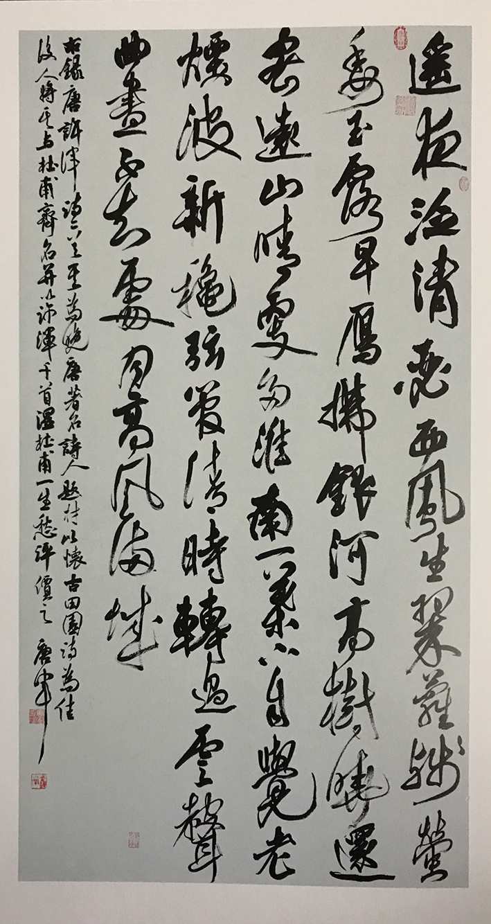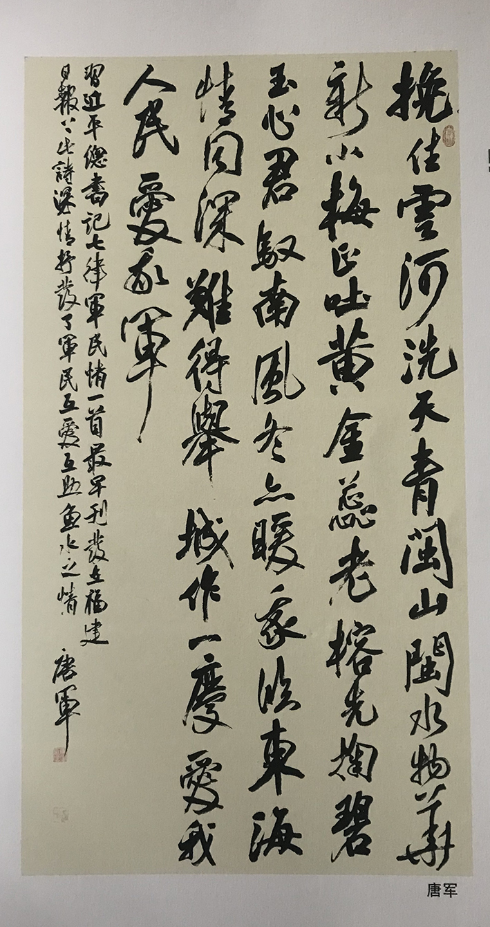 唐军,字继东。步逸堂主。南樵居士。居住上海市闵行。喜欢中国传统文化诗词歌赋。自幼习颜楷,欧楷。于二王、颜鲁公,欧阳率更、米南宫、祝枝山用心临摹。尤喜小王草书,倾情着力于怀素、山谷、傅山、王铎技法!后受教于众方家,转益多师,受益良多。现为上海市书法家协会会员,安徽省书法家协会会员。