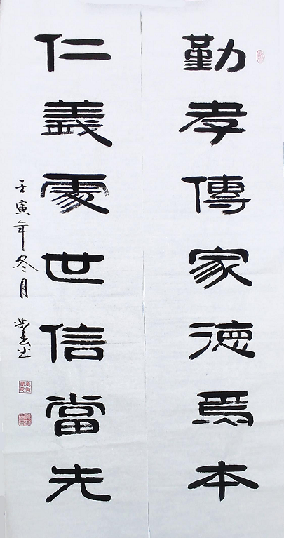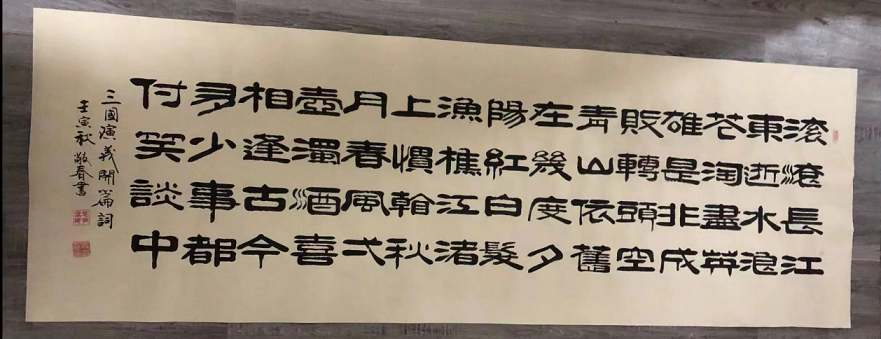 袁敬春先生自幼酷爱书法,主攻隶书,不失古法,勤学苦练,临池不辍,刻苦钻研,在坚实的传统功力基础上,充分发挥了自己的创造性,用现代的审美意识并加上文学素养,形成了鲜明的个人风格,打下了扎实的传统功力,经过多年的练习和揣摩,形成了自己独有的隶书艺术风格,更别具收藏艺术韵味。袁敬春先生认为在艺术观上坚守民族传统的阵地,但又不墨守古人的陈规,并在继承的基础上力求具有新的发展,创作的艺术作品一定要“尊重民族的欣赏习惯”。当然不排斥一切进步和优秀的外国艺术,而且应当认真钻研、吸收、融化和发展古今中外具有民族风格和时代特色的完美的艺术样式。艺术家则是把更多、更好的艺术作品奉献给自己的国家和所处的时代,当艺术作品达到一定的品位时,会带来它的副产品,即经济效益,但这永远是副产品,不能主次颠倒,否则艺术家本人和其作品就会一同贬值。作品笔力遒劲厚重,笔画粗细相称,结体平稳严谨。一丝不苟,均称慎密,墨酣意足,字字工整,闲适文雅,钢润峻拔,苍劲有力,浑厚潇洒,行笔流畅自然,清刚明俊,可谓形神皆备。袁敬春先生经过多年的磨炼,行成了自己独特的书法艺术风格,代表作品《沁园春雪》、《春夏秋冬》、《茶道》、《养得泽福》、《念奴娇.赤壁怀古》、《善缘》、《陋室铭》等等被多家媒体转载刊登,其榜书书法作品更是多次在全国展会上展出并获得各种奖项并被国内外众多书法爱好者和收藏家广泛收藏,被业界一致公认为具有收藏价值的书法艺术家。2013年被中国艺术品评估鉴定委员会评为8000元\平方尺。