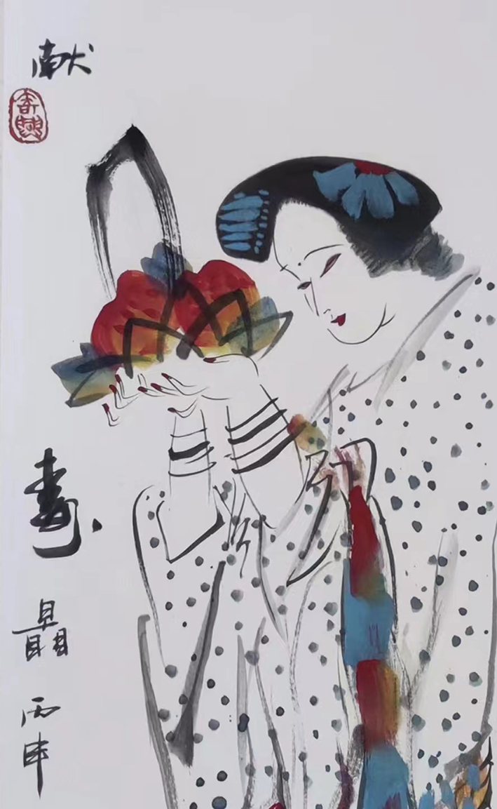 在国画界,徐民的人物画以其造型优美、笔墨精湛、清新灵气而被公认为人物画中的佼佼者。这位在画界很有影响力,做事又非常严谨低调的知名画家却很少举办自己的个人画展。20年来,徐民从一个普通的美术编辑、连环画画家,逐渐为国内外 画界所知名。在长期担任出版社的繁杂的行政业务工作之余,仍然努力作画。前几年转业到南开大学东方艺术系任教授、系主任,教学之余有较多时间作画和思考艺术,在我的印象中,徐民是一位在艺术上不怕辛苦、肯于攀登的人。在不断的艺术探索过程中,深厚的生活积淀和充足的思想感情,调动了徐民潜在的修养和能力,既创造了鲜明的个性形象,也造就了他作品中丰富多变的表现技法。傣族处于亚热带的绿色环境之中,民族热情,人民朴实,且民族色彩丰富。因此,在创作中,他把西画中色彩关系的变化及表现能力融入了中国画的流畅圆润的笔墨表现之中,恰到好处地体现出了南国的民族特色和人物性格。描绘西藏题材,由于其地理和社会人文环境不同,要把藏民那古朴而深厚的精神内涵体现出来,运用描绘傣族风情的技法表现则远不能达到与之相适应的完美艺术效果。因而,此时此刻便强调和发挥了传统中国画中纯粹的线的作用,利用线在变化中的情感内涵,着重焦笔干擦,以展现那带有苦涩与坚韧的人性中透出的古朴与充实。正是他在生活中善于挖掘新的感受和丰富自己的表现技法,所以,在当今水墨写实人物画创作艰辛的情况下,他的人物作品却常能给人以新意,富有生命气息,让人感奋不绝。徐民是一位勤奋专一的画家,他是那种视觉和思维都离不开画画的人,凡生活所历、视野所容,无不可以信手拈来,落笔成章。