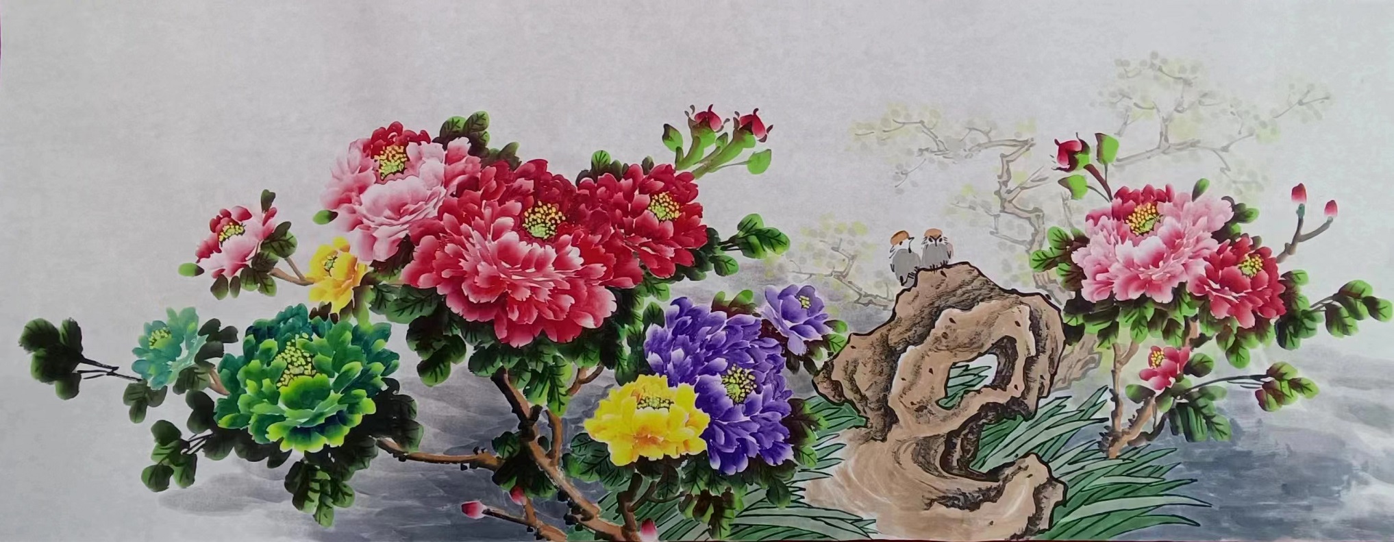 2015年春节前夕慰问国旗护卫队,赠送作品两幅。作品《盛世中华》牡丹图被悬挂在天安门城楼。