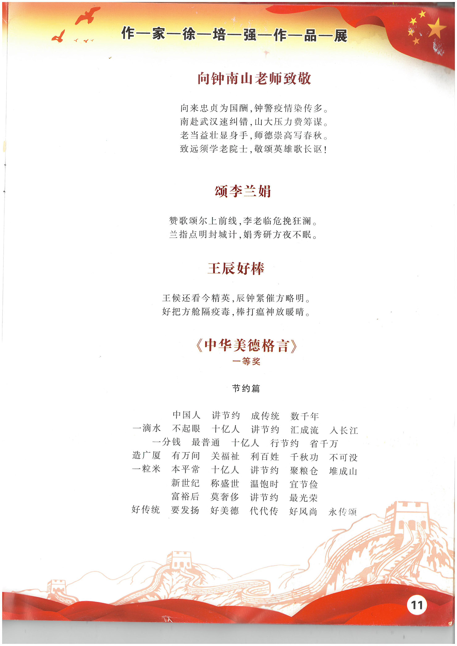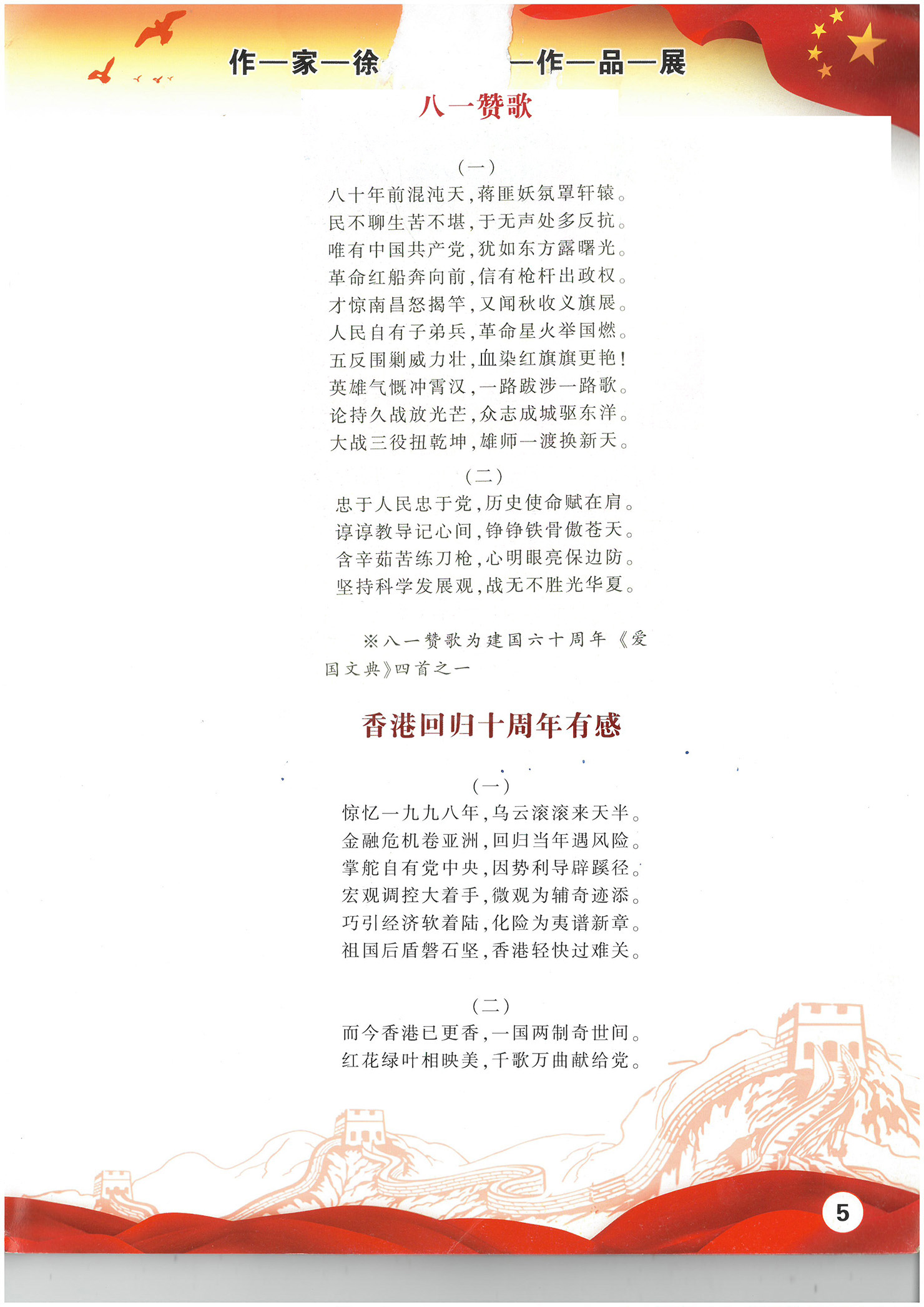 2009年国庆60周年,诗作品入选《爱国文典》同时被授予“中国改革开放三十周年诗词终身荣誉奖”:在香港回归十周年和党建 90周年《党魂耀中华》征文中诗作品均获得一等奖。