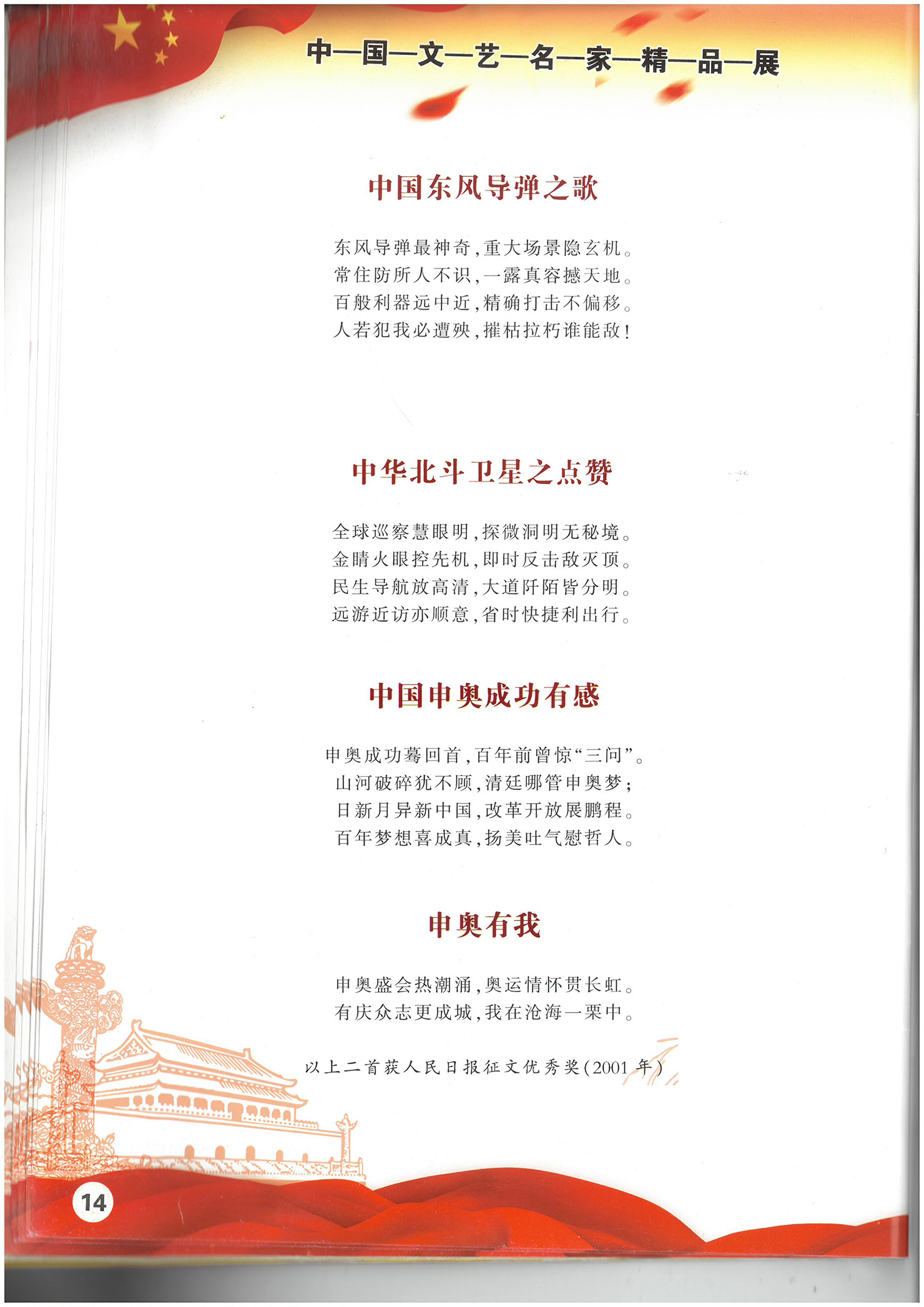 2001年在《人民日报》“申奥有我”征文活动中,诗歌荣获优秀奖。