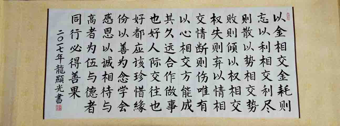 龙显光,男,1964年出生,苗族,大专文化,小学高级教师,贵州省铜仁市石阡县人。自幼酷爱书法,潜心练习,坚持不懈。三十年来擅用隶、楷、行、草体书写楹联,碑文、文书等,颇受社会赞誉。曾多次参加过全国书画竞赛,先后获得“最勤劳的艺术家”、”书画百科权威艺术家”称号,并荣获”百花奖中国首届书画、摄影大赛三等奖"等。