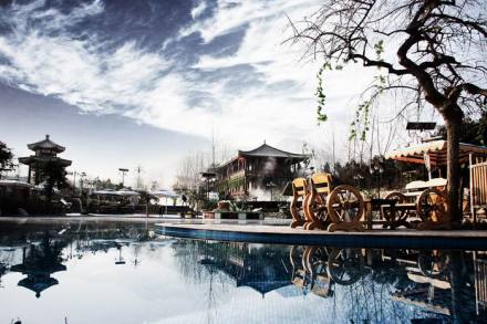 | 汤峪温泉 位于蓝田县汤峪镇,依山傍水,景色旖旎。汤峪温泉原名“石门汤泉”,为秦地胜地,唐时即建“大兴汤院”和皇家行宫“上林苑”。清道光年间因水患渐衰,汤泉水温达60°C以上,富含十多种矿物制,浴疗价值极高,民间称为“功德水”,又因春季浴洗更佳而谓“桃花水”。 |