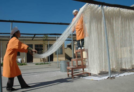 | 蓝田楼祝手工空心挂面 以蓝田楼祝村命名,楼祝村位于玉山镇北约2千米。村中有十有八户以生产手工空心挂面为业。所产挂面选用上等面粉,加盐水拌匀揉搓,直至软韧俱备时,用手工拉细,细如发丝,内为空心。该面筋道而韧,口感圆滑,放入锅中久煮不烂,在蓝田为送亲戚的馈赠。 |