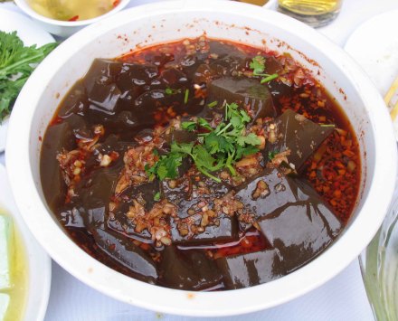 | 蓝田神仙粉 夏秋两季,采秦岭山中绿色无污染的糜子稍树叶,晾干后放入盆中,加入沸腾开水,待稍凉后用力揉搓,去叶柄及杂物后,放入一干净盘中,冷后即成凝胶状,切块后加入蒜、醋、油泼辣椒等。神仙粉味苦清肝,清火明目,是纯天然绿色食品。 |