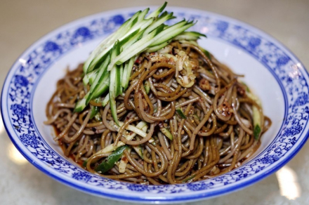 | 蓝田苦荞小麦饸饹 蓝田苦荞麦饸饹条细,色泽黄亮,棉软筋韧,清香利口。因糖分含量少,粗纤维多,利于消化,对糖尿病有一定的疗效,为陕西著名小吃。 |