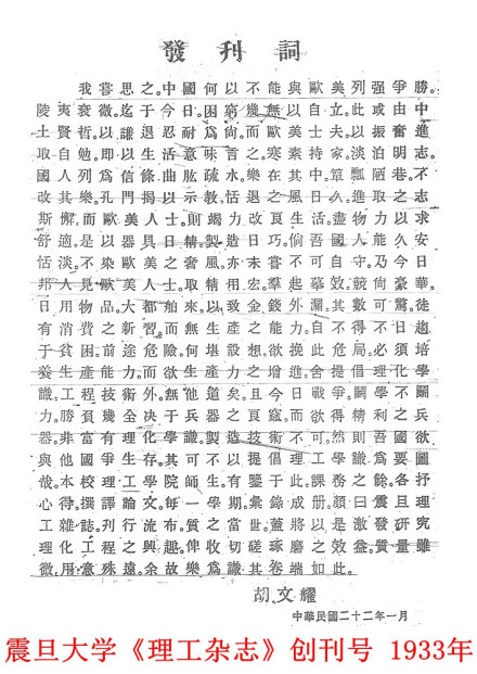 1933年震旦大学理工学院创办《理工杂志》,胡文耀亲自撰写发刊词