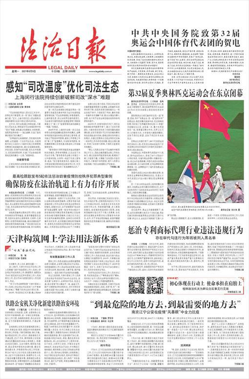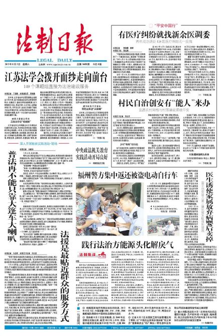 民主法制领域党和国家最重要的主流媒体,中国最大的法律资讯提供商,中国最具影响力的法律专业传媒集团。设有要闻版、立法政法版、司法版、政府法治版、经济版、视点版、国际版、公司法务专刊、法律人专刊、中国律师专刊。