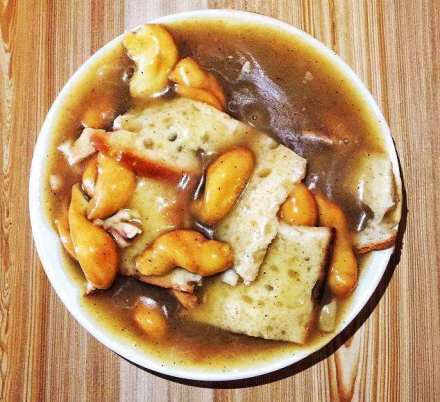 | 糊锅 酒泉的特色小吃。酒泉最具代表性的小吃应该就算“糊锅”了,尤其是老酒泉人最爱吃,卖糊锅的店主在店门口架上一口大锅,汤料用鸡汤,投入蚕豆粉汁,成糊状,再加蚕豆粉制成的粉块、粉条、以及鸡丝、肉片,再把炸好的大麻花掰成麻花瓣,放入配好的汤中即成,其味鲜香,突出姜与胡椒的辣味。 |