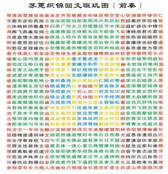 苏蕙独守长安空闺中,日子稍长,便感寂寞难耐。丈夫在身边时,不能感觉出他太多好处,一离开,思念之情却是刻骨铭心,不由得悔恨当初的负气。悔恨之余,她便用吟诗作文来排遣孤寂的时光。后突发奇想,又经反复推敲构思,将所写诗词编排整理暗藏在29行、29列的文字里。然后怀着满腔幽思、废寝忘食地把诗词织在八寸锦缎上。苏蕙把这副锦缎命名为“璇玑图”。璇玑,原意是指天上的北斗星,之所以取名璇玑是指这副图上的文字,排列象天上的星辰一样玄妙而有致,知之者可识,不知者望之茫然。其中更暗寓她对丈夫的恋情,就象星星一样深邃而不变。