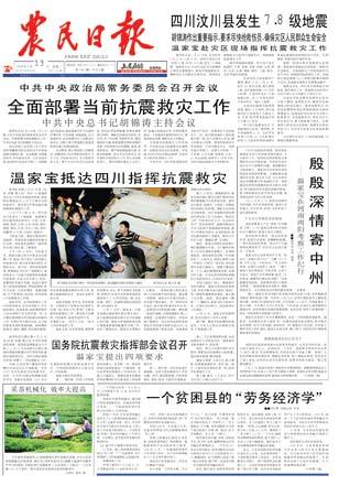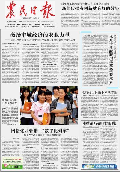 近三年来,《农民日报》解放思想,突破传统,在改版的基础上,扩版取得初步成功,报纸从形式到内容都有很大改观,报纸的权威性和影响力得到提升,在事关全局的重大报道中,《农民日报》的声音在读者中越来越响亮,在农业、农村和农民问题的宣传报道上,树立了独特的优势。 《农民日报》在10亿农村读者中独具感召力和知名度,并发行到20多个国家和地区,承担着沟通城乡的重任、构筑起农产品产销的桥梁。 回首风尘仆仆的跋涉,《农民日报》离不开大家的扶助;展望旌旗猎猎的征程;《农民日报》更期盼大家的支持;让我们并肩携手,共同托起明天的太阳。