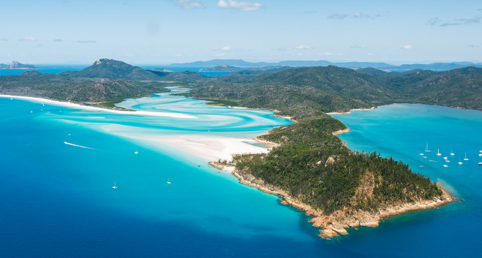 白天堂沙滩位于圣灵岛的东边,整个沙滩绵延7公里,是世界十大最美的沙滩之一。这里的沙含硅量高达98%,沙质细如粉末,被评为全世界最环保和干净的沙滩。为了保护岛上生态环境,这里没有酒店和餐厅,也没有居民居住。