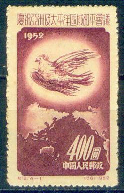 1952年10月2日-12日,亚洲及太平洋区域和平会议在北京召开。参加会议的有37个国家的367位代表,还有列席代表和特邀来宾。会期11天,共有112位代表和来宾发言。为了庆祝这次盛会召开,中国邮电部在会议开幕当天发行了一套纪念邮票。