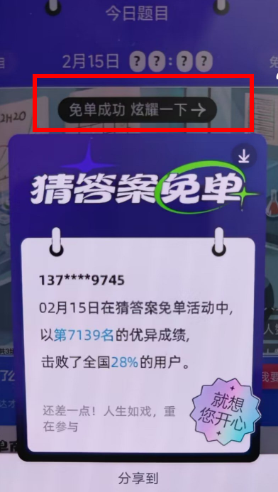 2,进入之后可以到饿了么免单的界面,如果免单成功的话,上面会在画圈的部位显示【免单成功炫耀一下】,大家点一下就行了;