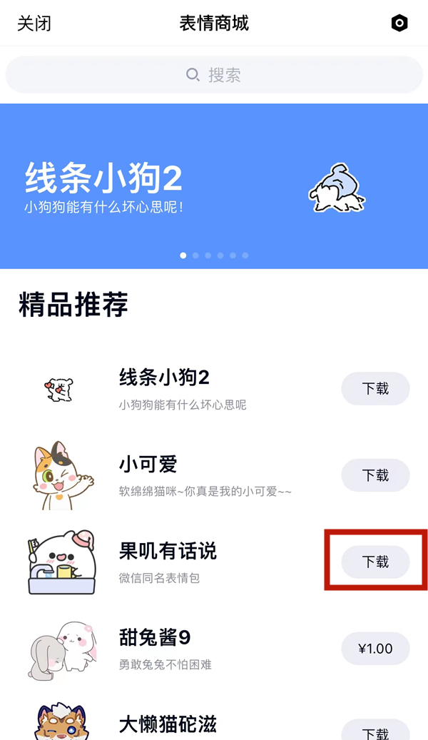 3、进入表情商城后,搜索找到要添加的表情,点击后面的下载按钮即可。