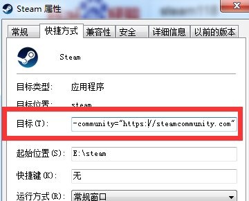 3、接着右键steam图标,选择属性,输入: -community="https://steamcommunity.com"点击确定进行保存,如果提示快捷方式出现问题,我们在前面加上一个空格;