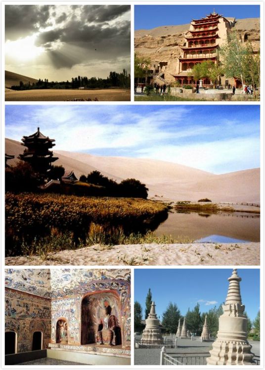 “两关遗迹、千佛灵岩、危峰东峙、党水北流、月泉晓彻、古城晚眺、绣壤春耕、沙岭晴鸣”,被称为“敦煌八景”。敦煌、平遥、凤凰古城、九寨沟与乌镇、丽江古城、水墨婺源和新疆布尔津白哈巴村共同评为蜜月必去中国最美的八个小镇。