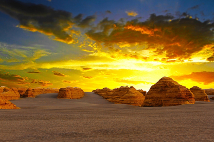 | 敦煌雅丹国家地质公园 地处敦煌西200千米处,分布区长宽各10千米,土丘高大,多在10—20米,长200~300米。又名三陇沙的地名始见于汉代,位置在古玉门关外,丝绸之路北线由此通过。三陇沙雅丹地貌,其走向与盛行的西北风向垂直,而与山地洪水流的方向一致,和玉门关形成敦煌第二大景区,因其怪异特点,故有魔鬼城。 |