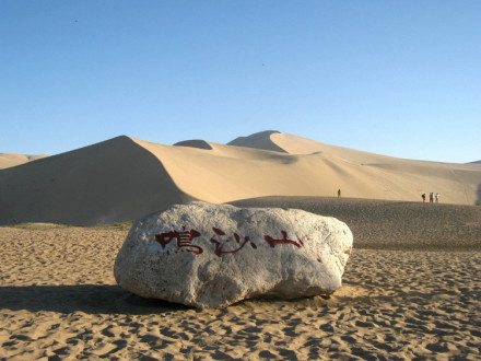 | 鸣沙山 位于敦煌市南郊七千米处。古代称神沙山、沙角山。鸣沙山,因沙动有声而得名。古称“沙角山”、“神沙山”。山有流沙积聚而成,东西长约40千米,南北宽约20千米,最高海拔1715米。“沙岭晴鸣”为敦煌“八景”之一。 |