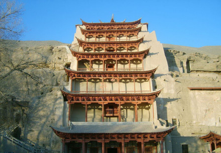 | 莫高窟 又称“千佛洞”,中国四大石窟之一。位于敦煌县城东南25千米的鸣沙山下,因地处莫高镇而得名,是中国最大、最著名的佛教艺术石窟。分布在鸣沙山崖壁上三四层不等,全长一千六百米。现存石窟492个,壁画总面积约45000平方米,泥质彩塑2415尊,是世界上现存规模最大、内容最丰富的佛教艺术圣地。1987年,被联合国科教文组织列为世界文化遗产。 |