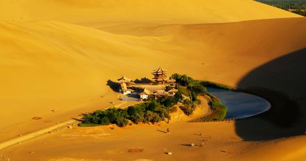 | 月牙泉 被鸣沙山环抱,长约150米,宽约50米,因水面酷似一弯新月而得名。在鸣沙山下,景区内的罗布麻、枸杞等药材很多,自汉朝起即为“敦煌八景”之一,得名“月泉晓彻”。月牙泉南北长近100米,东西宽约25米,泉水东深西浅,最深处约5米,弯曲如新月,因而得名,有“沙漠第一泉”之称。月牙泉有四奇:月牙之形千古如旧、恶境之地清流成泉、沙山之中不淹于沙、古潭老鱼食之不老。 |