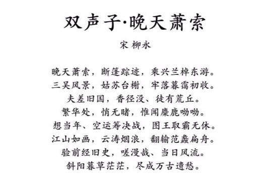 《双声子·晚天萧索》是北宋词人柳永创作的一首怀古词。词的上片写词人暮秋登临时的所见,词人登临姑苏台,游览春秋时吴国旧迹。下片侧重写词人的感慨,通过今日的荒凉与当年繁华的对比,表现了一种深沉浓烈的兴亡感。萧索荒落的景物中交织着历史的沧桑与人生的反思,形成一种苍凉浑厚的意境。笔调雄浑、庄重,与柳永一贯的艳俗的词风截然不同。